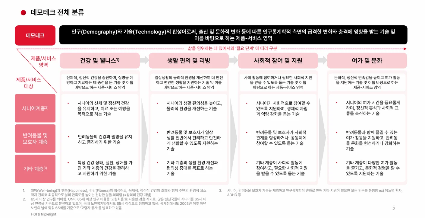 데모테크 : 인구(Demography)와 기술(Technology)의 합성어로써, 출산 및 문화적 변화 등에 따른 인구통계학적 측면의 급격한 변화와 충격에 영향을 받는 기술 및 이를 바탕으로 하는 제품-서비스 영역이라 정의함
