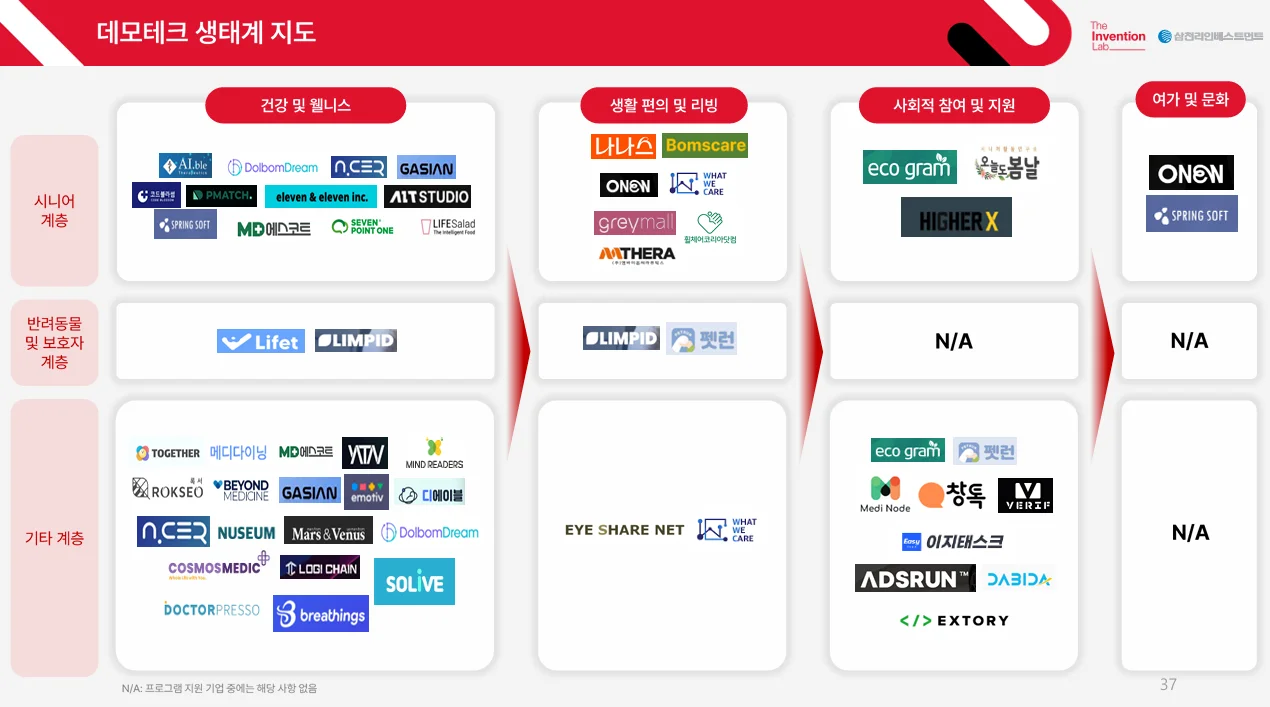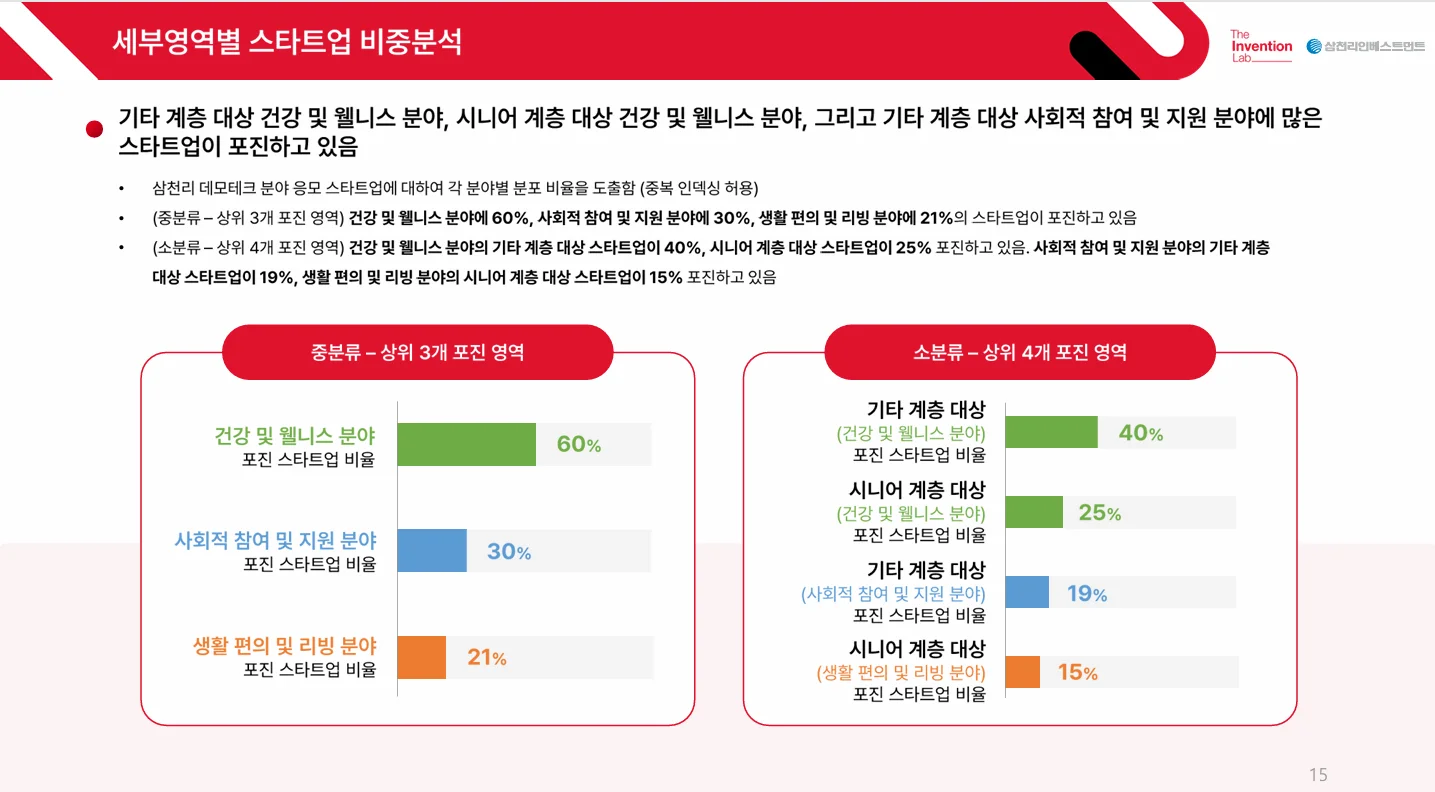 안내사항 본 보고서는 2024년 7월부터 11월까지 삼천리와 더인벤션랩이 운영한 삼천리 S-Together 프로그램에 지원한 402개 스타트업을 데모테크 분야로 분석한 보고서로, 산업 분석을 위한 참고 자료이며, 특정 기업을 홍보하거나 투자 권유의 목적이 아닙니다. 보고서에 포함된 내용은 더인벤션랩의 분석 기준에 따르며, 무단 복제 및 배포는 금지되어 있습니다. *배포일: 2025.02.19.
